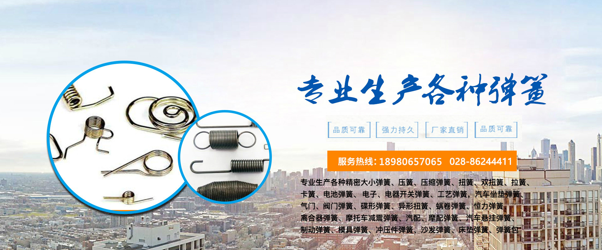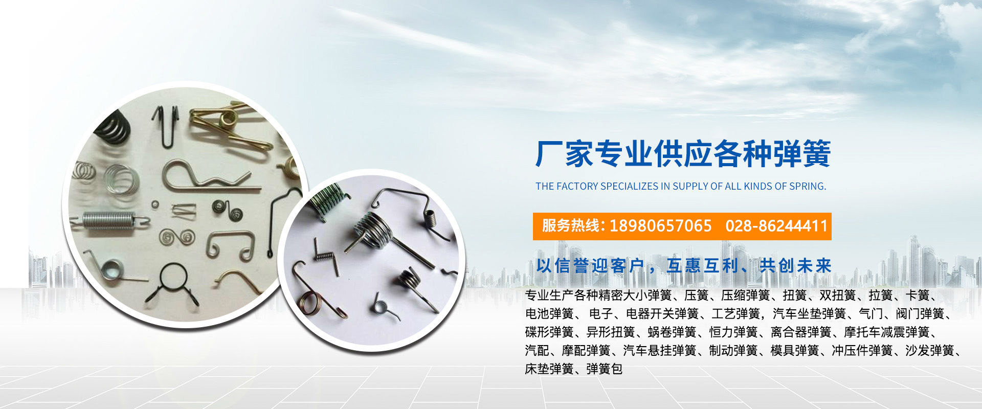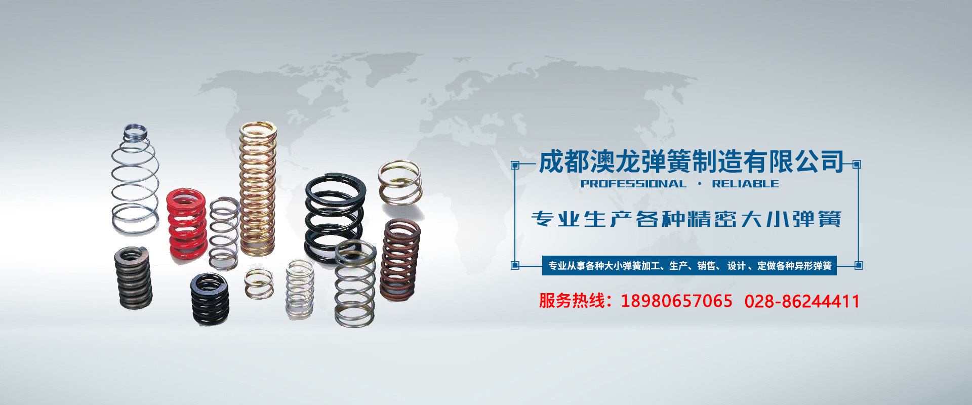 成都澳龍彈簧制造有限公司是一家專(zhuān)業(yè)從事各種大小彈簧加工、生產(chǎn)、銷(xiāo)售、 設(shè)計(jì) 、定做各種異形彈簧、專(zhuān)業(yè)生產(chǎn)各種精密大小彈簧、壓簧、壓縮彈簧、扭簧、雙扭簧、拉簧、卡簧、電池彈簧、 電子、電器開(kāi)關(guān)彈簧、 工藝彈簧,汽車(chē)坐墊彈簧、氣門(mén)、閥門(mén)彈簧、碟形彈簧、異形扭簧、蝸卷彈簧、恒力彈簧、離合器彈簧、摩托車(chē)減震彈簧、汽配、摩配彈簧、汽車(chē)懸掛彈簧、制動(dòng)彈簧、模具彈簧、沖壓件彈簧、沙發(fā)彈簧、床墊彈簧、彈簧包系列等等,并承接各種小五金、沖壓件機(jī)械及特定、不規(guī)則彈簧的加工服務(wù)。